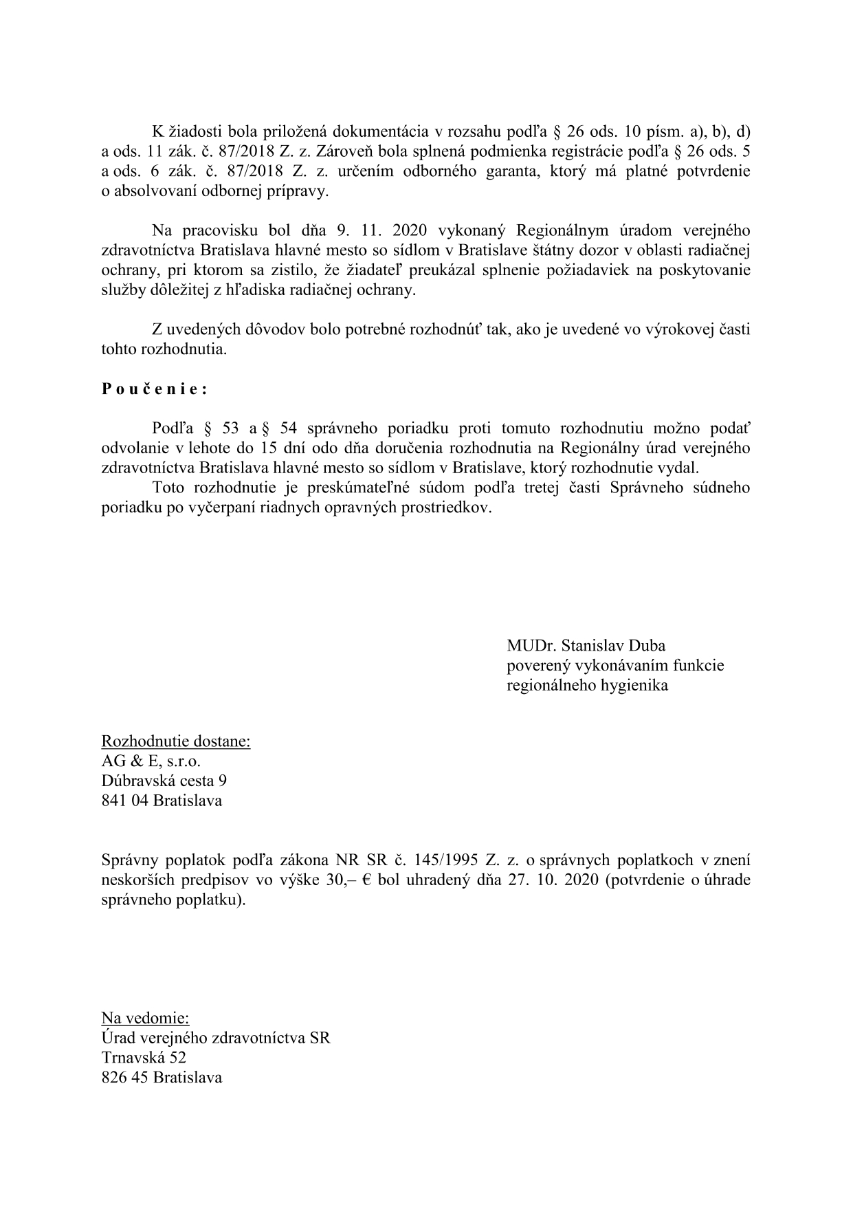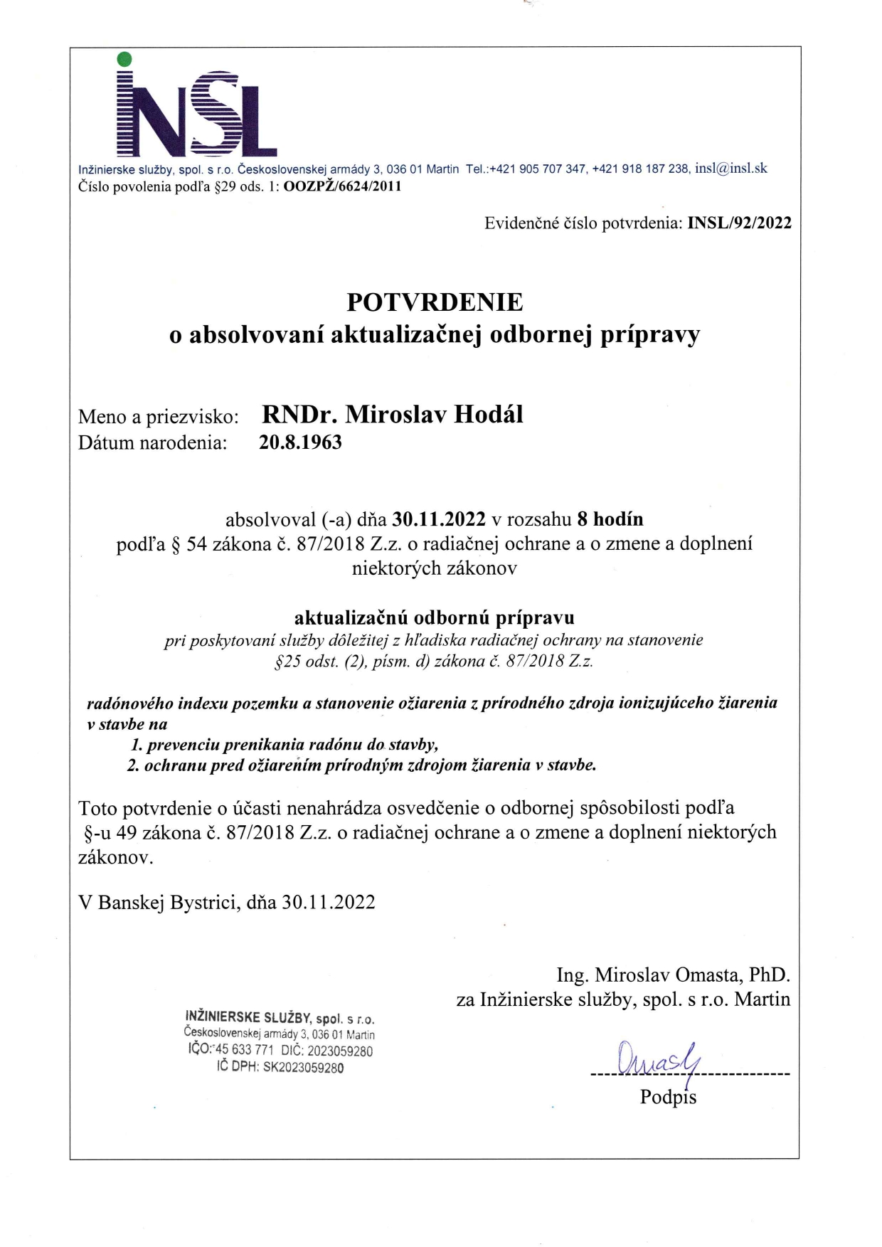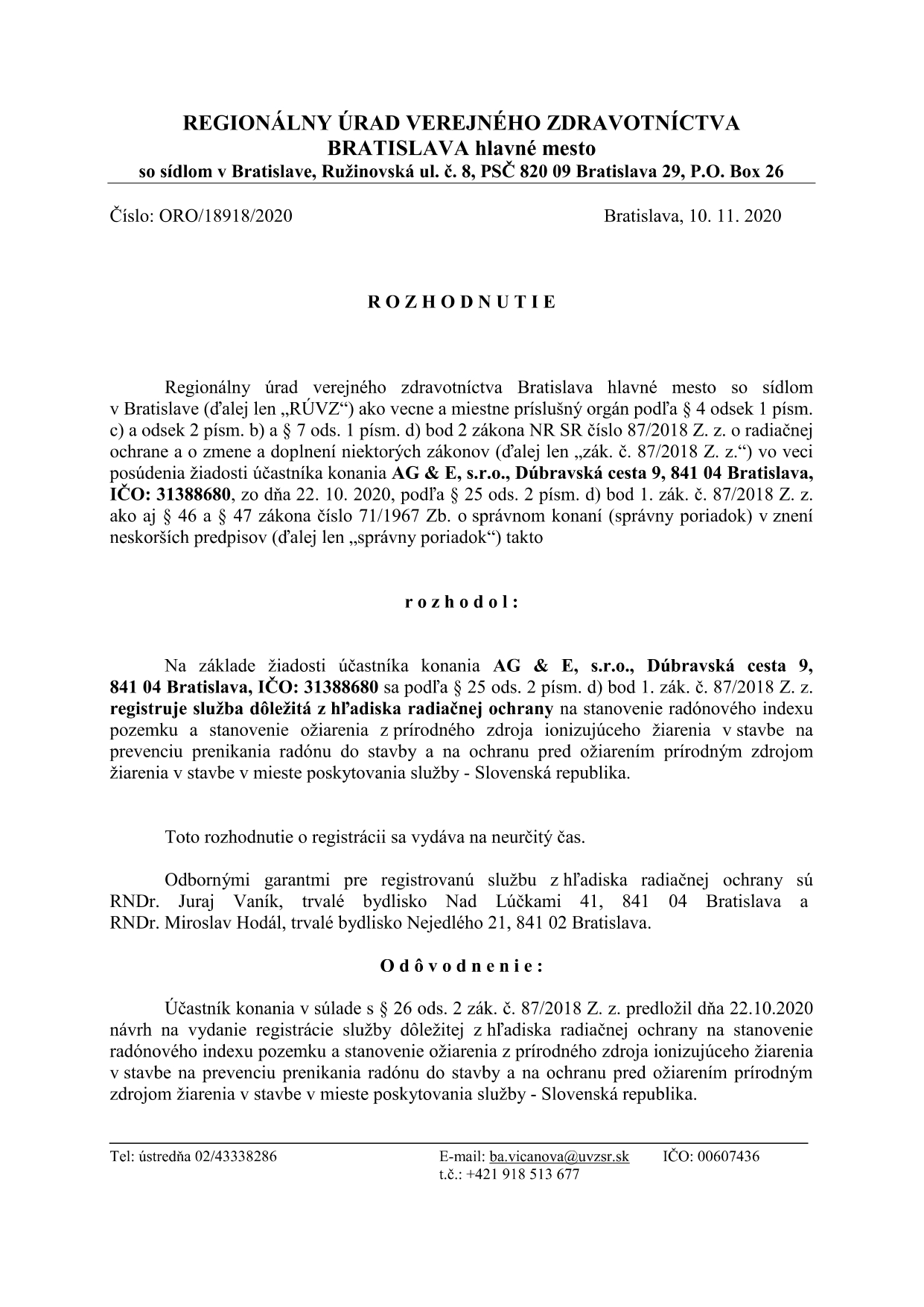 Naša firma je autorizovaná na vykonávanie merania radónu v pôdnom vzduchu a v budovách (č. roz. 2018/900/001758/00207, ÚVZ SR č. OOZPŽ/514/2013, ORO/18918/2020).